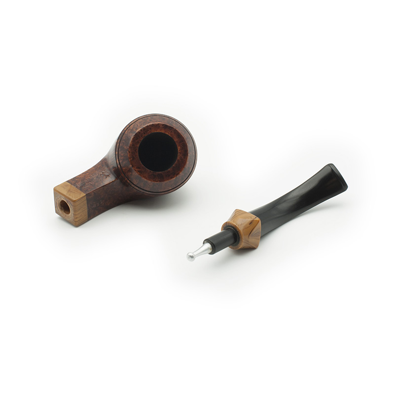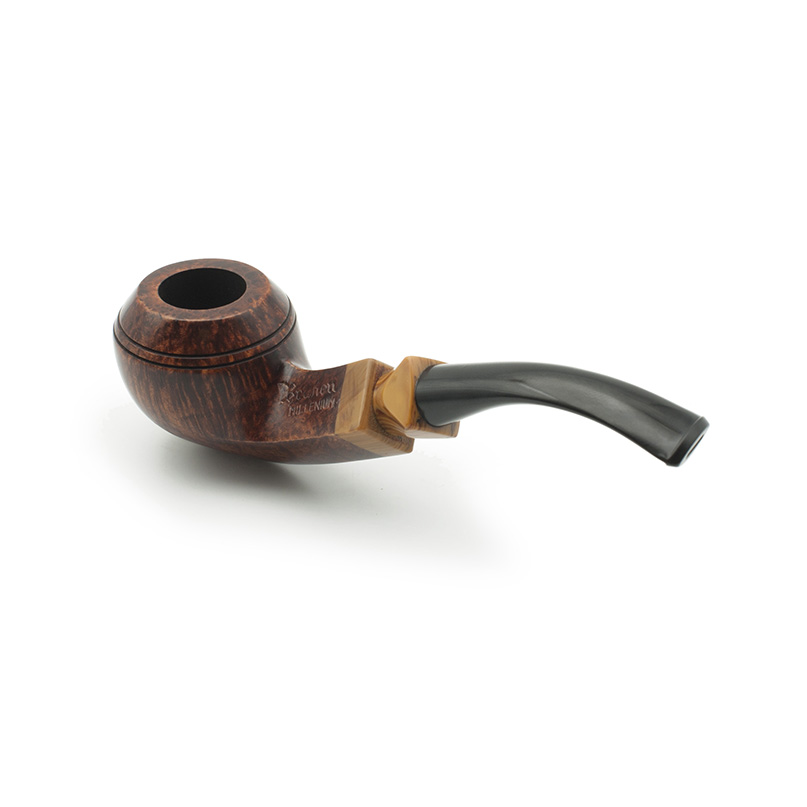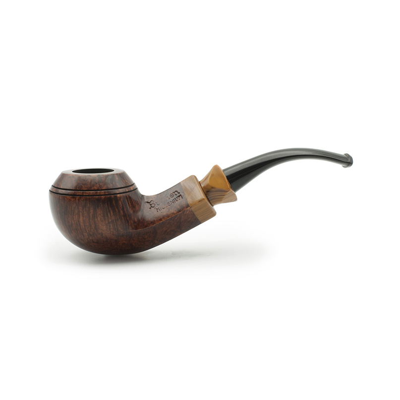 Pipa Bruken de la serie Millenium. Esta serie fue creada en el año 2000, se caracteriza por diseños clásicos y un ejemplo de artesanía Bruken, con una excelente calidad/precio. La boquilla está hecha a mano en ebonita y la corona en metacrilato de dos colores: marrón claro con aguas oscuras y verde con aguas de color oro. La cazoleta está adornada con un anillo de metacrilato del mismo color que la boquilla. El color marrón castaño de las pipas es el mismo para todos los modelos. Todas se fabrican sin filtro y con enfriador de aluminio.
