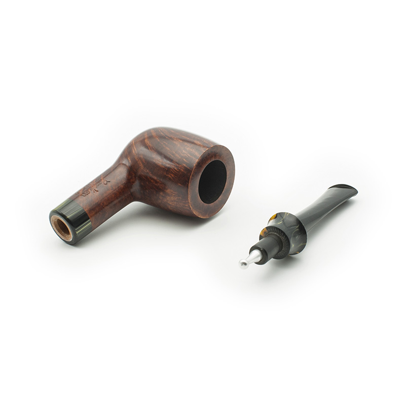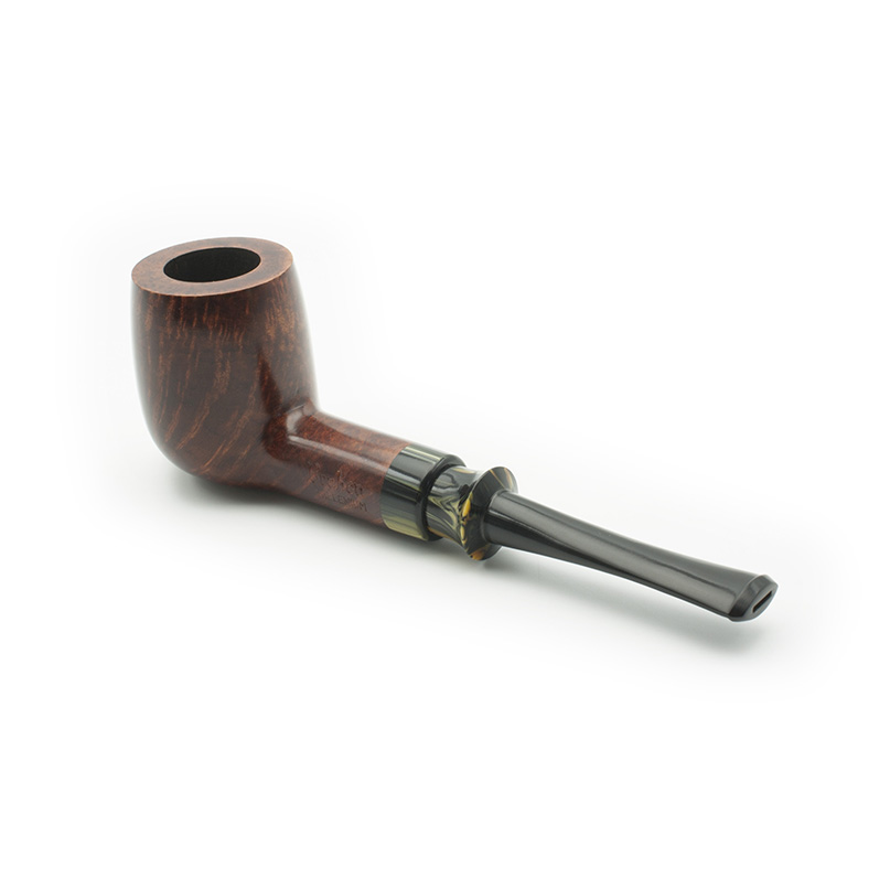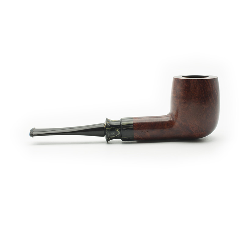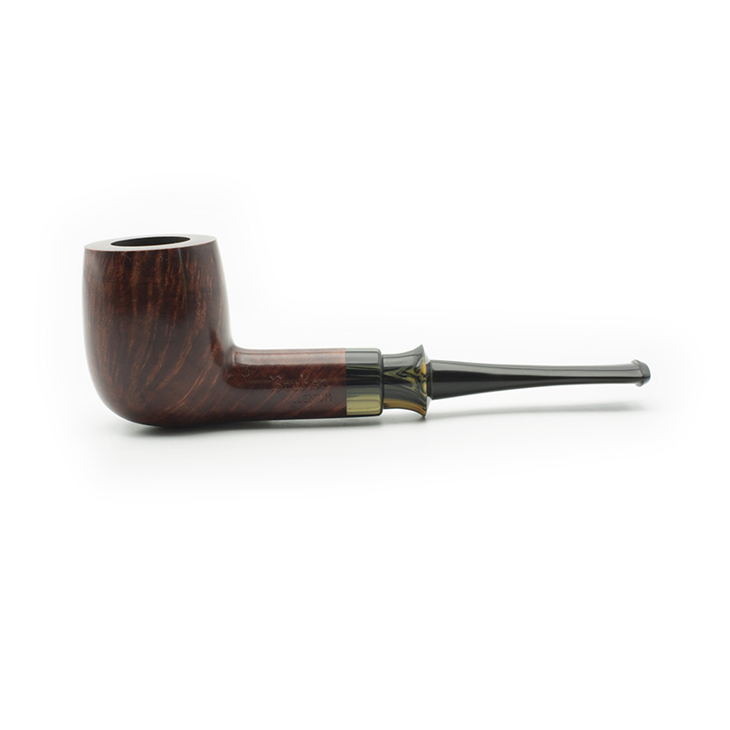 Pipa Bruken de la serie Millenium. Esta serie fue creada en el año 2000, se caracteriza por diseños clásicos y un ejemplo de artesanía Bruken, con una excelente calidad/precio. La boquilla está hecha a mano en ebonita y la corona en metacrilato de dos colores: marrón claro con aguas oscuras y verde con aguas de color oro. La cazoleta está adornada con un anillo de metacrilato del mismo color que la boquilla. El color marrón castaño de las pipas es el mismo para todos los modelos. Todas se fabrican sin filtro y con enfriador de aluminio.