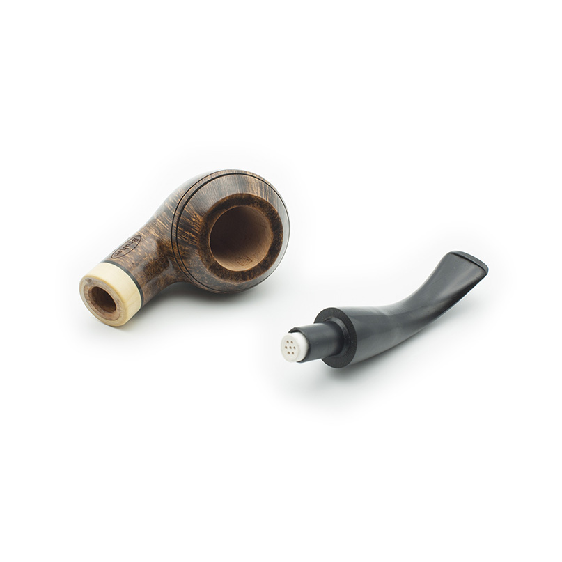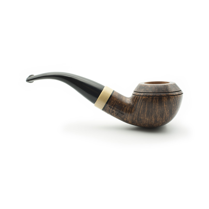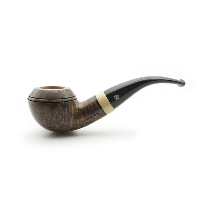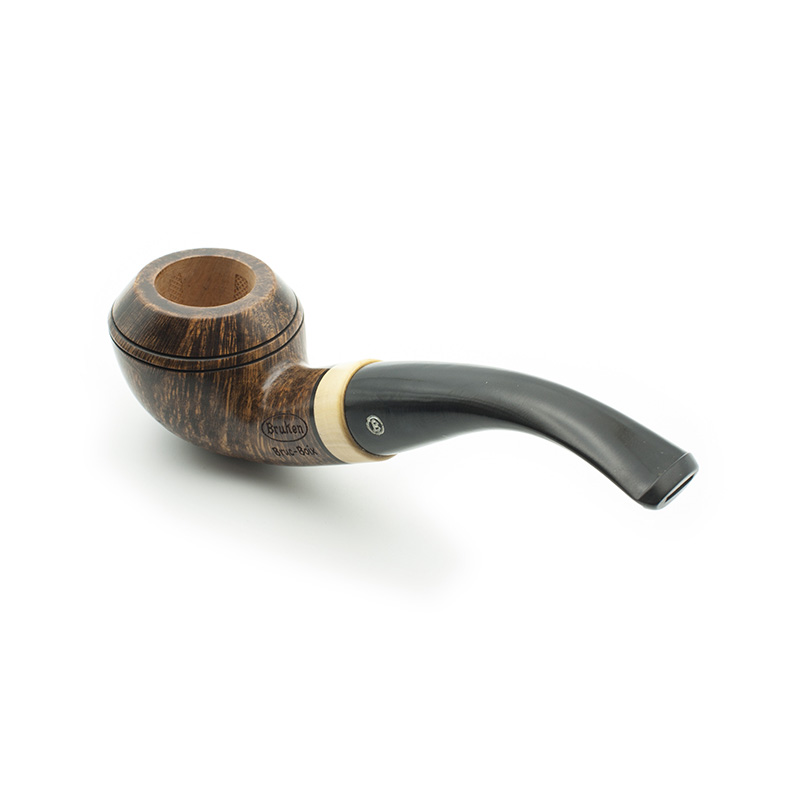 Pipa Bruken de la colección Bruc-Boix, con acabado Mediterráneo. La colección Bruc-Boix está formada por 9 modelos de pipas de madera de brezo, con un diseño exclusivo y variado. Las pipas de la colección Bruc-Boix se caracterizan por estar adornadas con un casquillo de boj (boix) y un pequeño anillo de metracrilato o en su caso de ébano. Se fabrica con un mínimo de capacidad de 3 gramos, con filtro de 9 mm y sin filtro, con enfriador de aluminio, según modelo. Cada modelo está disponible en 3 tipos de acabados: Rioja (G4), Mediterráneo (G3-G2) Rustic (G1).
