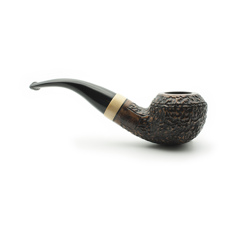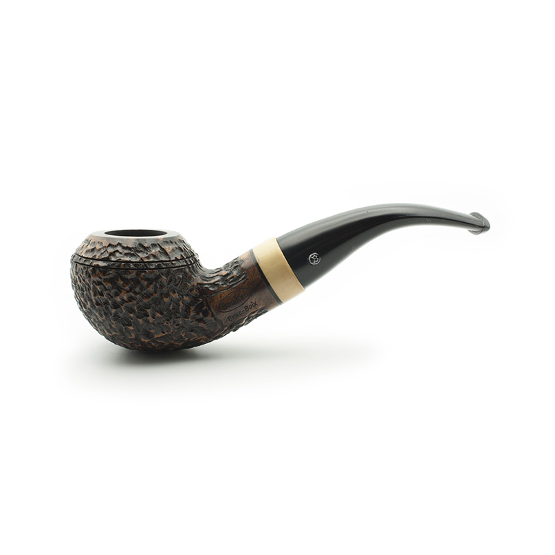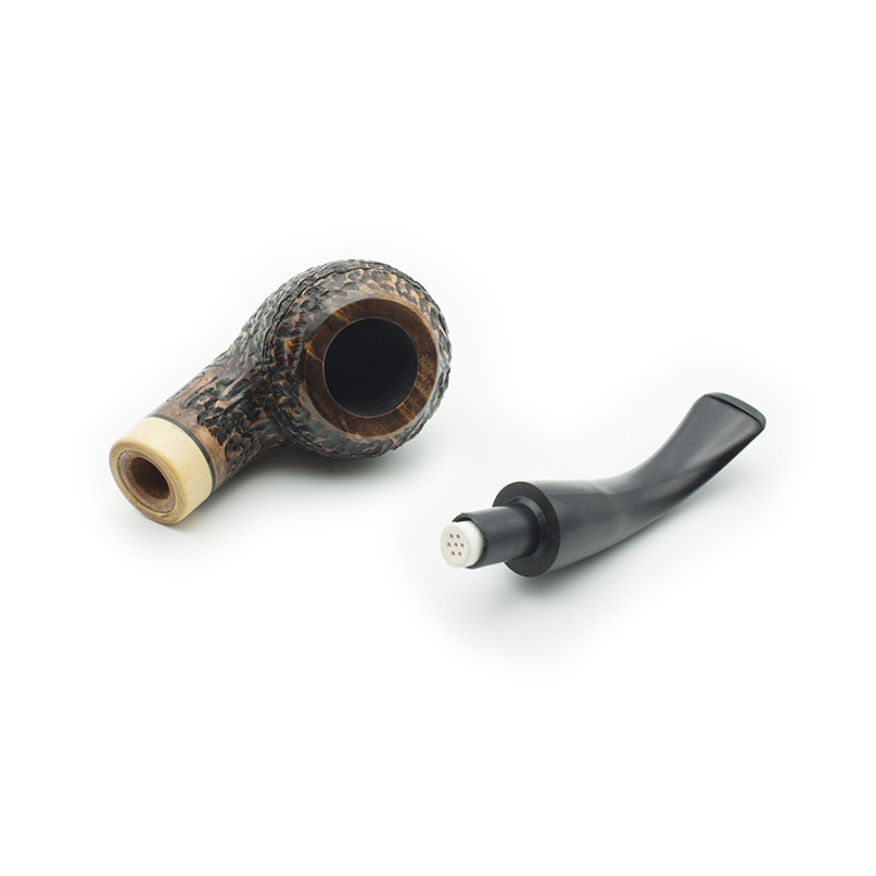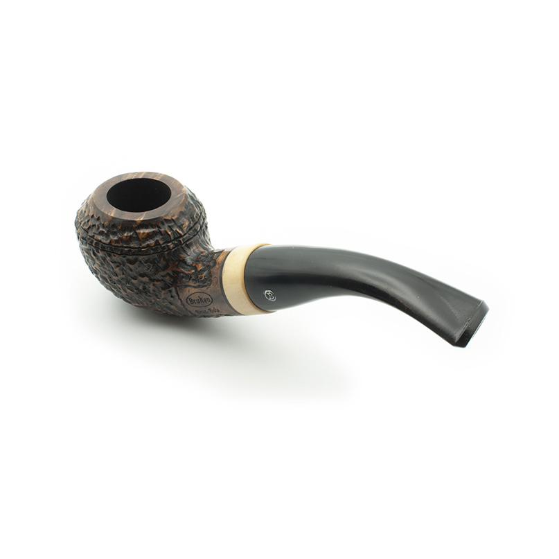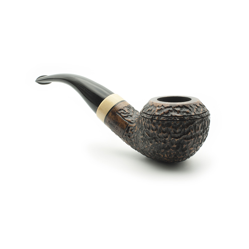 Pipa Bruken de la colección Bruc-Boix, con acabado Rusticada. La colección Bruc-Boix está formada por 9 modelos de pipas de madera de brezo, con un diseño exclusivo y variado. Las pipas de la colección Bruc-Boix se caracterizan por estar adornadas con un casquillo de boj (boix) y un pequeño anillo de metracrilato o en su caso de ébano. Se fabrica con un mínimo de capacidad de 3 gramos, con filtro de 9 mm y sin filtro, con enfriador de aluminio, según modelo. Cada modelo está disponible en 3 tipos de acabados: Rioja (G4), Mediterráneo (G3-G2) Rustic (G1).