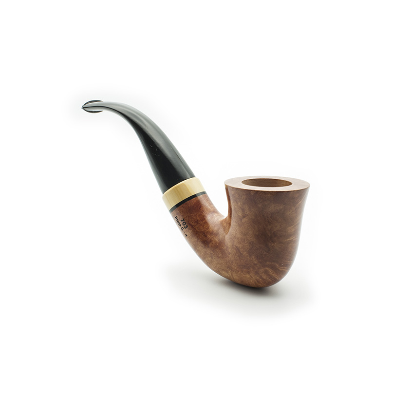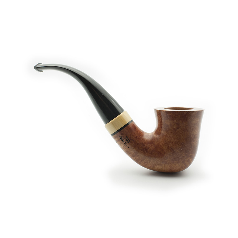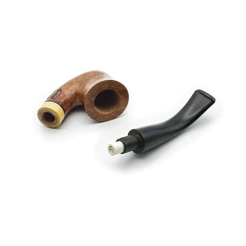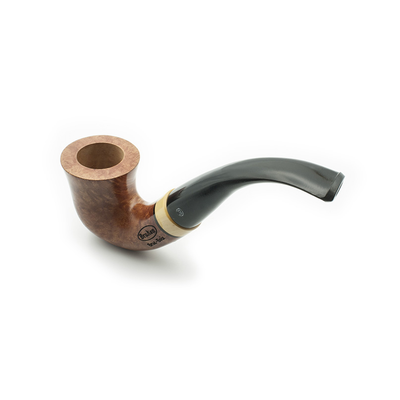 Pipa Bruken de la colección Bruc-Boix, con acabado Rioja. La colección Bruc-Boix está formada por 9 modelos de pipas de madera de brezo, con un diseño exclusivo y variado. Las pipas de la colección Bruc-Boix se caracterizan por estar adornadas con un casquillo de boj (boix) y un pequeño anillo de metracrilato o en su caso de ébano. Se fabrica con un mínimo de capacidad de 3 gramos, con filtro de 9 mm y sin filtro, con enfriador de aluminio, según modelo. Cada modelo está disponible en 3 tipos de acabados: Rioja (G4), Mediterráneo (G3-G2) Rustic (G1).