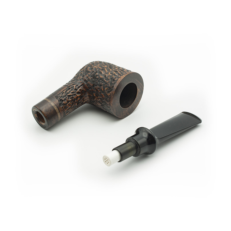 Pipa Bruken de la colección Bruselas, con acabado Rusticado. La colección Bruselas está formada por 6 modelos de pipas, con un diseño clásico y exclusivo. Realizadas con madera de raíz de brezo de alta calidad. Están adornadas con un anillo de madera de Boj incrustado en el caño de la cazoleta. La boquilla es de metacrilato con filtro de 9mm. Cada modelo está disponible en 4 tipos de acabados: Rioja (Calidad Premium), Mediterráneo (Calidad Extra) Cherry (Calidad Selecta) y Full Rustic (Calidad Standard).