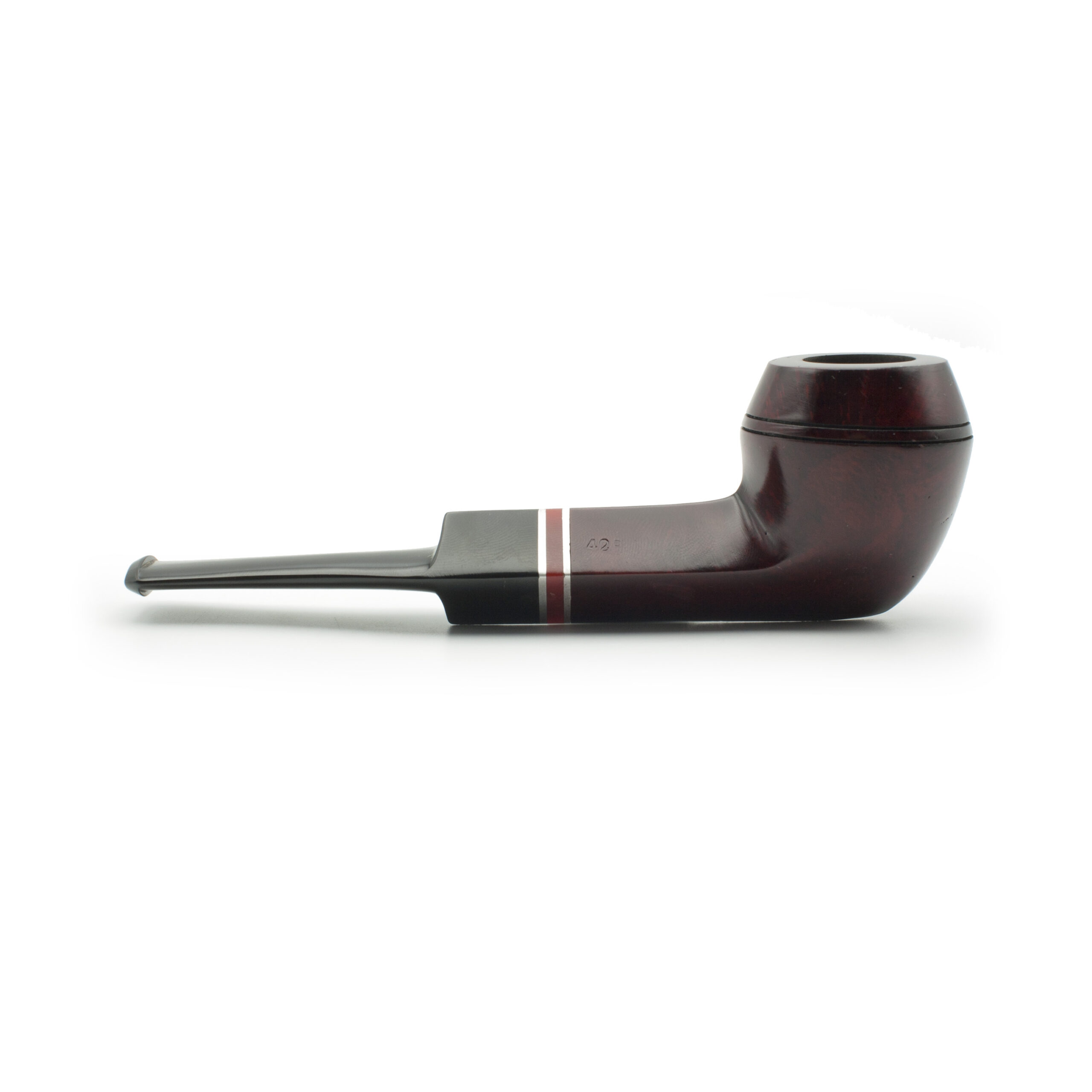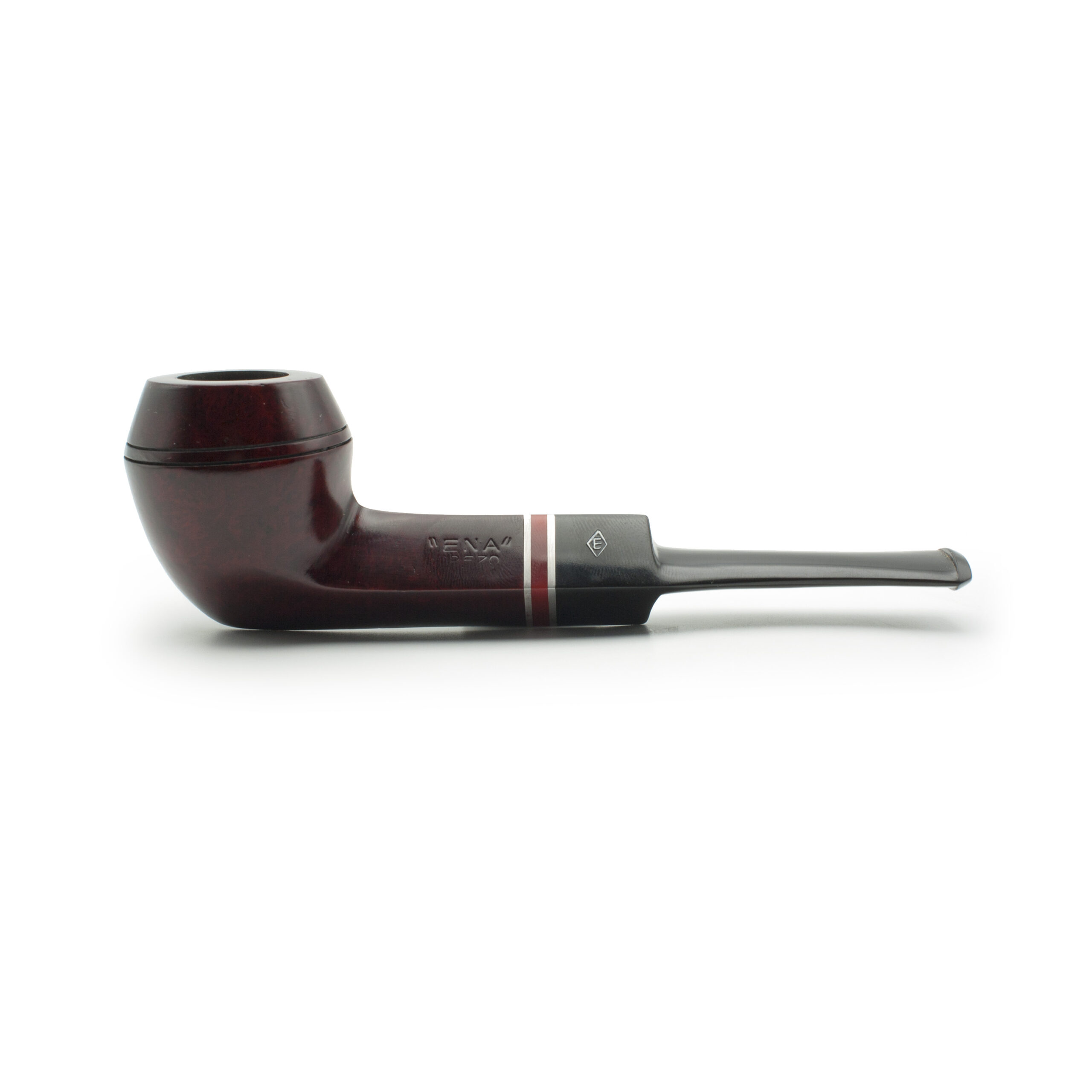 Pipa ENA de la colección IOCOSA. Diseño clásico y formas redondeadas con un anillo compuesto por dos exteriores de una aleación especial de plata/aluminio y uno rojo de metacrilato en el centro, incrustados en boquilla de ebonita. Las pipas de esta colección están disponibles en tres tipos de acabados: Smooth, Half Rustic y Full Rustic.