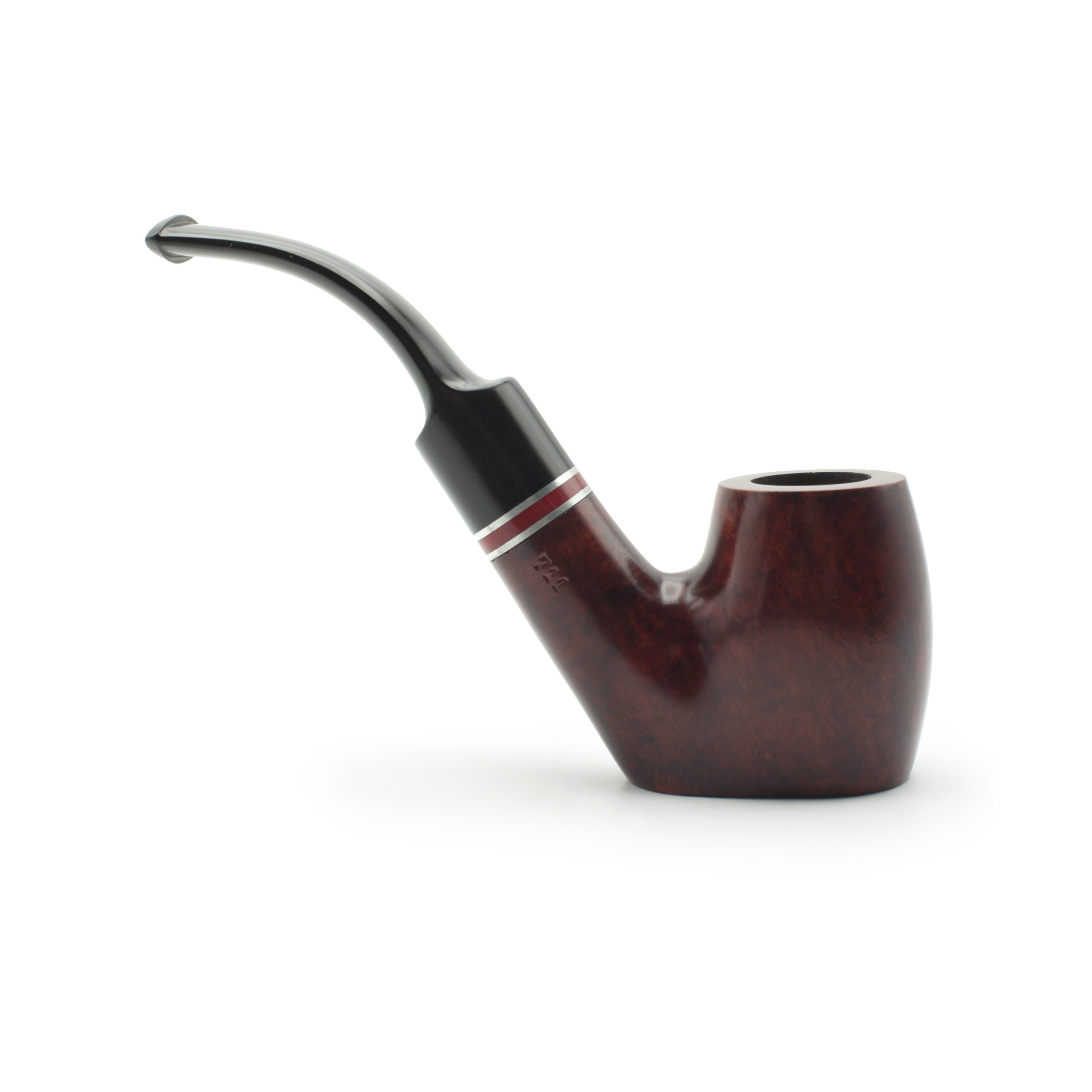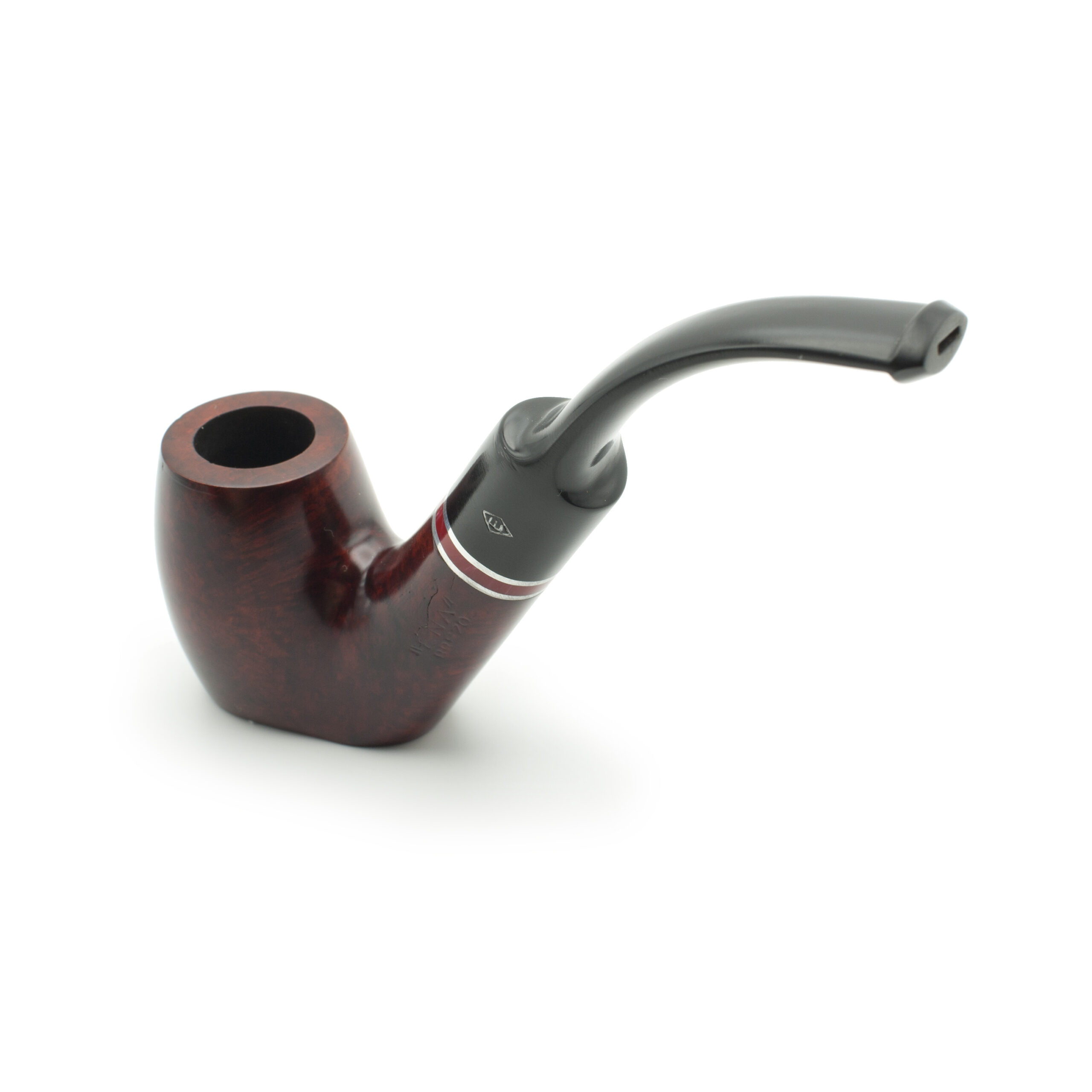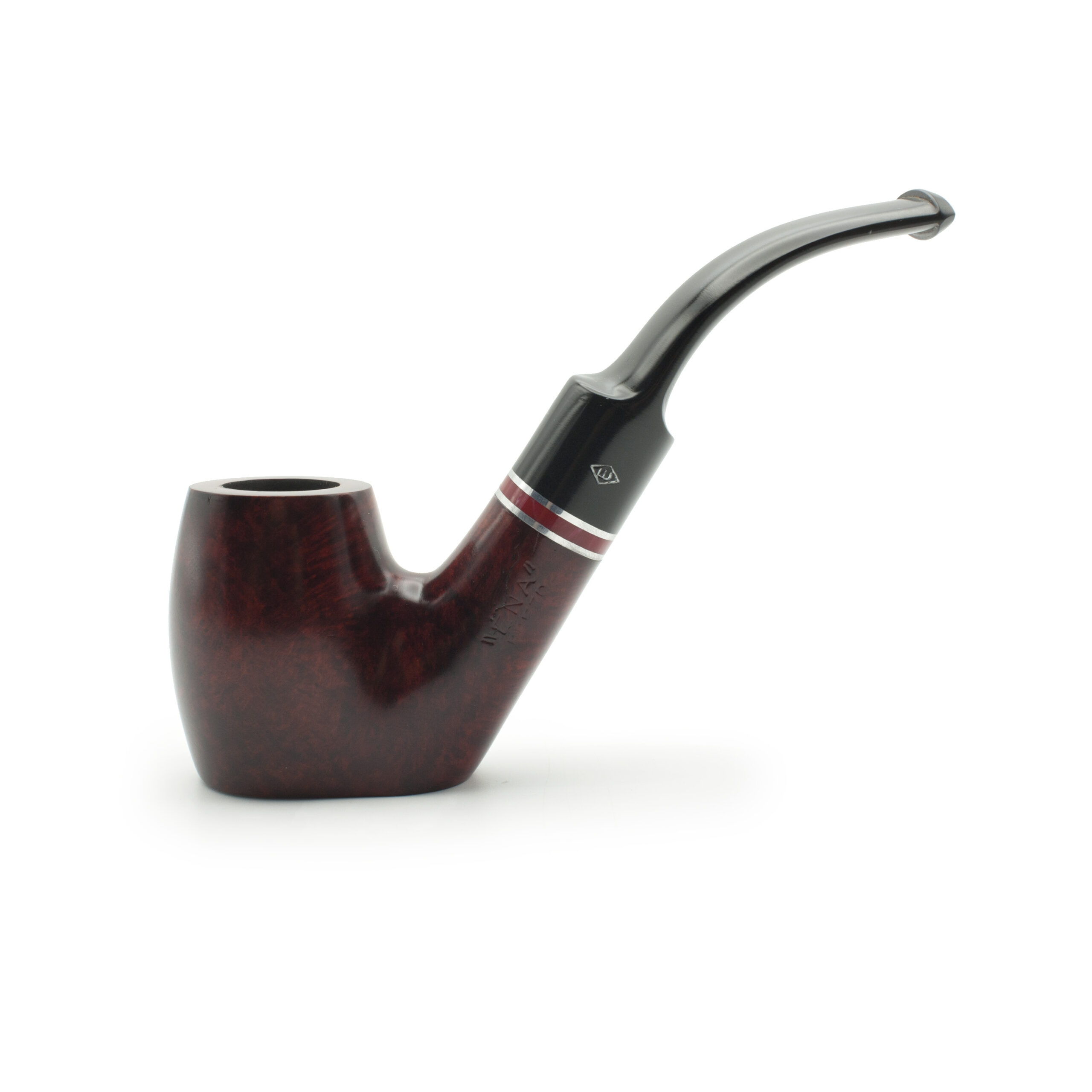 Pipa ENA de la colección IOCOSA. Diseño clásico y formas redondeadas con un anillo compuesto por dos exteriores de una aleación especial de plata/aluminio y uno rojo de metacrilato en el centro, incrustados en boquilla de ebonita. Las pipas de esta colección están disponibles en tres tipos de acabados: Smooth, Half Rustic y Full Rustic.