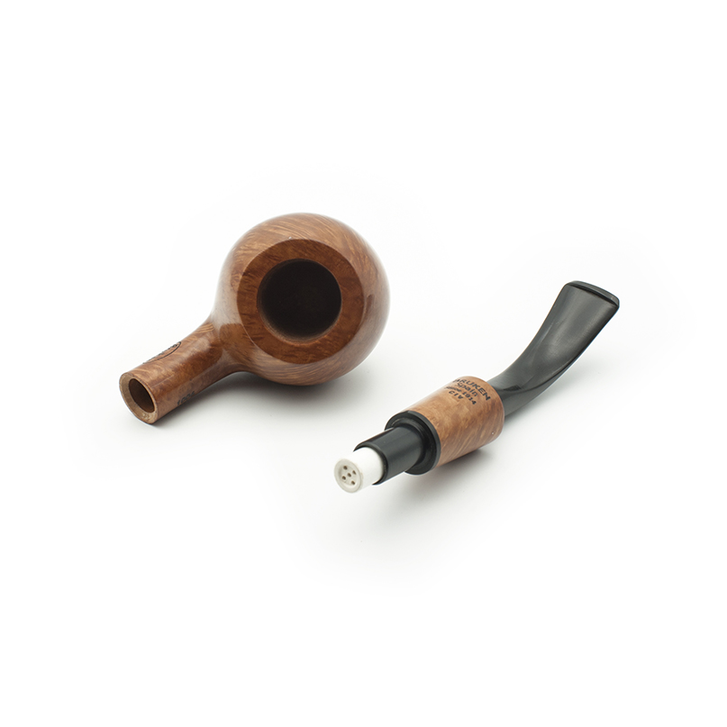 Pipa Bruken de la colección Master Deluxe, con acabado Rioja. La colección Master Deluxe está formada por 6 modelos de pipas, con un diseño exclusivo, uno de las colecciones más destacadas y artesanales de Bruken. Todos los modelos de pipa se fabrican sin filtro, con enfriador de aluminio y boquilla de metacrilato. Están adornadas con un anillo de metacrilato incrustado en el caño de la cazoleta. Cada modelo está disponible en 6 tipos de acabados: Straight Grain (Calidad Premium), Rioja (Calidad Premium), Mediterráneo (Calidad Extra) Cherry (Calidad Selecta), Full Rustic (Calidad Standard), Half Rustic (Calidad Standard), Night (Calidad Standard).